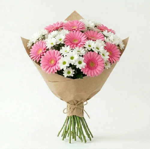 זר גרברות ורודות וחרציות לבנות